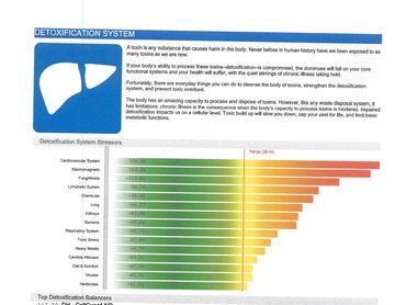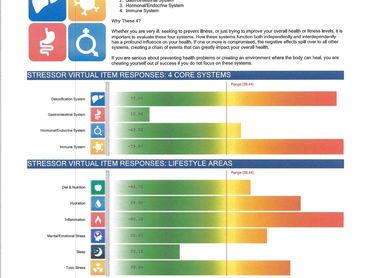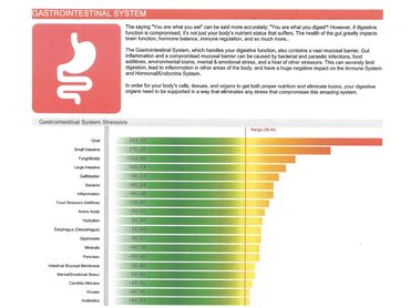 Comprehensive/Advanced Scan/Elite: This report displays balancers, products, and out-of-range Virtual Items. This report allows the Holistic Practitioner to analyze and discover more details about your current health. With this data we will be able to develop and wellness plan suited just for you, making goals your wellness goals achievable. A variety of charts are used to organize the data.